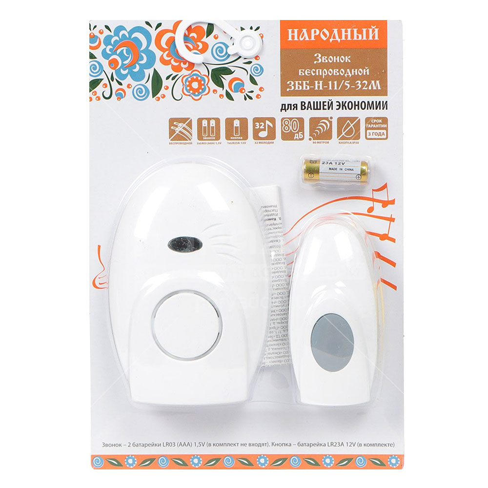 Звонок беспровод 32 мелодии,(2х1,5VAА) "НАРОДНЫЙ" ЗББ-Н-11/5-32М TDM