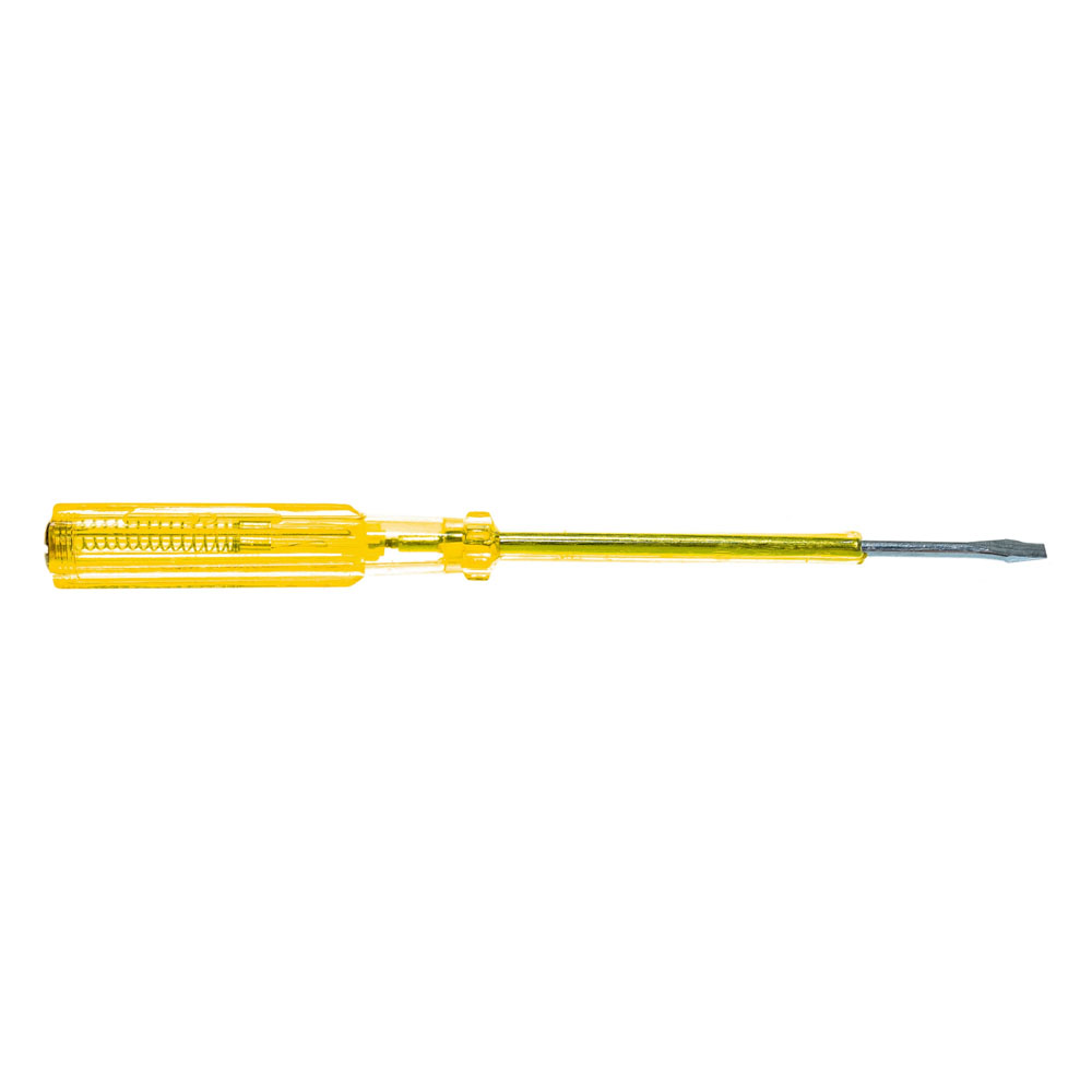 Индикаторная отвертка 6875-304B предназначена для электромонтажных работ. Это самое простое и распространенное устройство для безопасного определения контактным и бесконтактным способом наличия электрического тока в электрических сетях с напряжением 220В, а также прозвонки целостности электрических цепей электрических лампочек, предохранителей, проводов, вилок и т.п.Отвертка данной модели оснащена светодиодным индикатором. Если есть напряжение, индикатор светится, если нет, не светится. Минусом такого типа отверток является высокий порог индикации напряжения - от 60В. Они хороши лишь для определения наличия напряжения и фазы. Определить обрыв цепи при помощи данного инструмента невозможно.Особенности:- С помощью металлической прищепки отвертку можно легко прицепить к одежде, чтобы не потерять.- Наконечник с контактной поверхностью.- Корпус отвертки изготовлен из прочного пластика