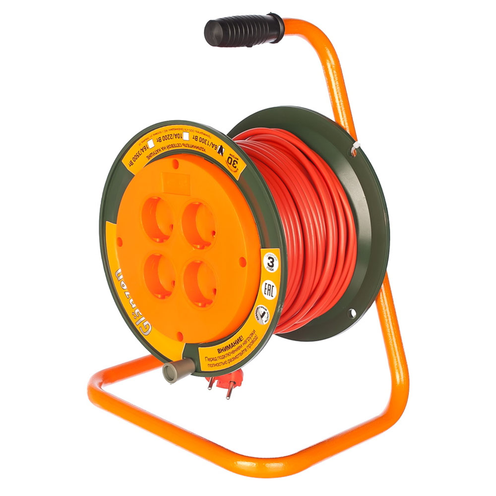 Силовой удлинитель на катушке GLANZEN EB-30-002 применяется в различных сферах деятельности, где требуется проводить работу с электроприборами на больших расстояниях. Изделие состоит из пластиковой катушки с четырьмя розетками, провода типа ПВС длиной 30 метров, специальной ручки и устойчивой пластиковой рамы.