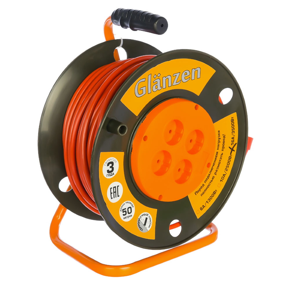 Силовой удлинитель на катушке 4 гн. ПВС 2х2,5 Glanzen EB-50-008 подходит для одновременного подсоединения до 4 вилок различного оборудования, приборов или электроинструмента. Изделие имеет длинный сетевой шнур (50 метров), который удобно располагается на пластиковой катушке. Диаметр барабана составляет 300 мм. Эргономичная ручка для переноски надежно зафиксирована на прочной металлической треноге.