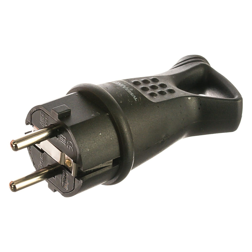 Угловая однофазная вилка с ушком, каучук UNIVersal 0003 служит для присоединения к сети электропитания различных бытовых электроприборов мощностью до 3,5 кВт. Изделие предназначено для эксплуатации в суровых условиях - на открытом воздухе или во влажных или запыленных помещениях, например: на дачном участке, на строительных площадках и пр. Угловой ввод питающего кабеля и наличие «кольца» позволяют сэкономить пространство около стационарной розетки, а также легко и быстро, без лишних усилий извлекать вилку из сети