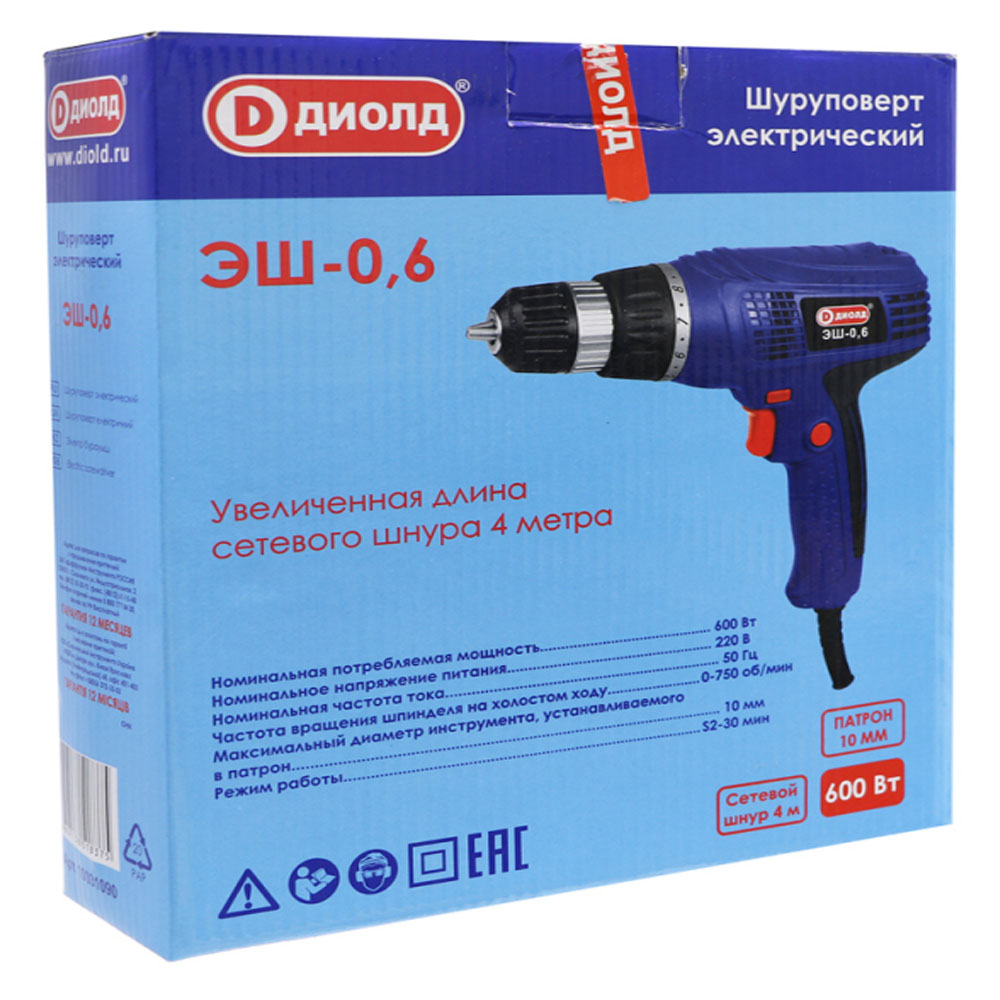 Дрель-шуруповерт ДИОЛД ЭШ-0,6 (мощ.600 Вт, крут. мом. 20Нм, максим.диам.шуруп.6 мм)