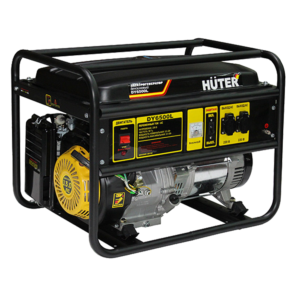 Бензиновый генератор HUTER DY6500L является мобильной электрогенерирующей установкой наружного применения, приводимой в действие поршневым четырехтактным двигателем внутреннего сгорания, мощностью 13 л.с. и ручной системой запуска. Топливом для него служит неэтилированный бензин марки АИ-92 или, при наличии специального оборудования, газ (метан или пропанобутановая смесь). Двигатель приводит в движение альтернатор (генераторную машину) однофазный, синхронного типа со щеточным возбуждением. Эта машина способна вырабатывать ток напряжением 220 В (50 Гц), и имеет номинальную мощность 5000 Вт. Благодаря вместительному топливному баку на 22 л, она может действовать непрерывно на протяжении примерно 10 часов. Общий вес агрегата – 84 кг.
