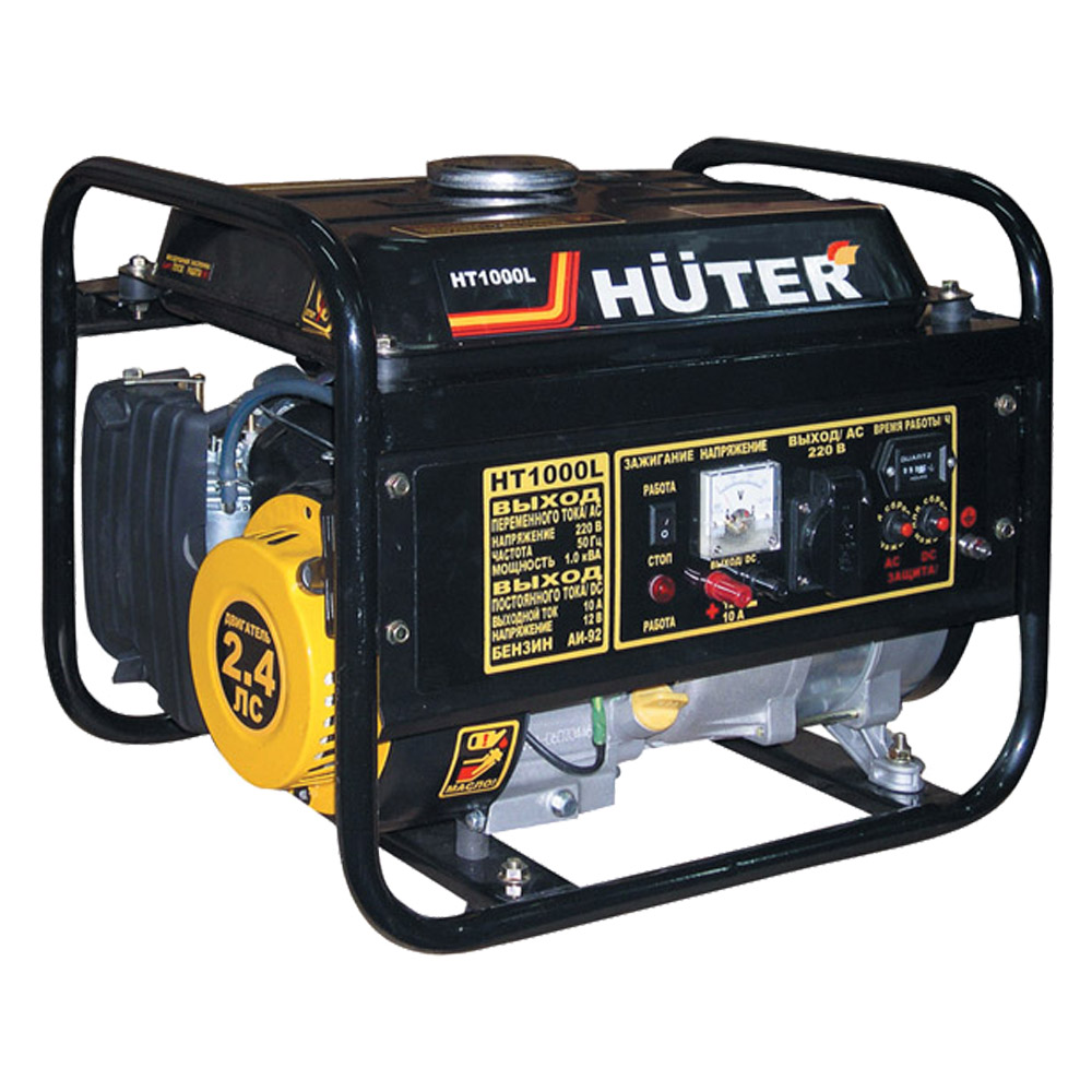 Huter HT1000L – переносной бензиновый генератор переменного тока 220 В и постоянного тока 12 В номинальной мощностью 1 кВт. Основа конструкции агрегата – четырехтактный одноцилиндровый двигатель внутреннего сгорания Huter 152F. В качестве топлива используется неэтилированный бензин АИ-92, емкость бензобака составляет 4,8 литра. Без дозаправки генератор сможет проработать на средней мощности до 8 часов. Возможна также работа на бытовом сжиженном газе – пропане или пропан-бутане, в случае подключения специализированной системы питания. Охлаждение двигателя происходит воздушным способом, что позволяет не зависеть от погодных условий и работать даже при температуре -20°С.
