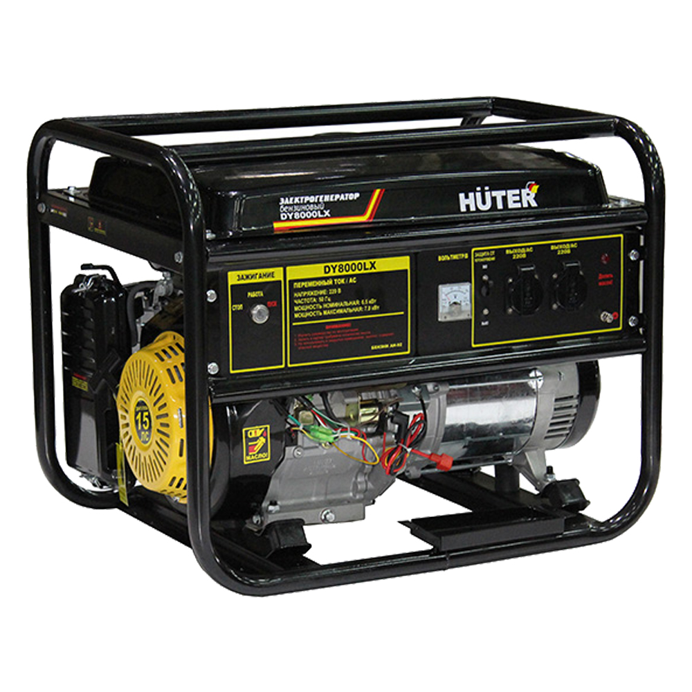 Бензиновый электрогенератор Huter DY8000LX с колесами работает на бензине. Имеет большой объем топливного бака, благодаря чему может работать без дозаправки на протяжении длительного времени.