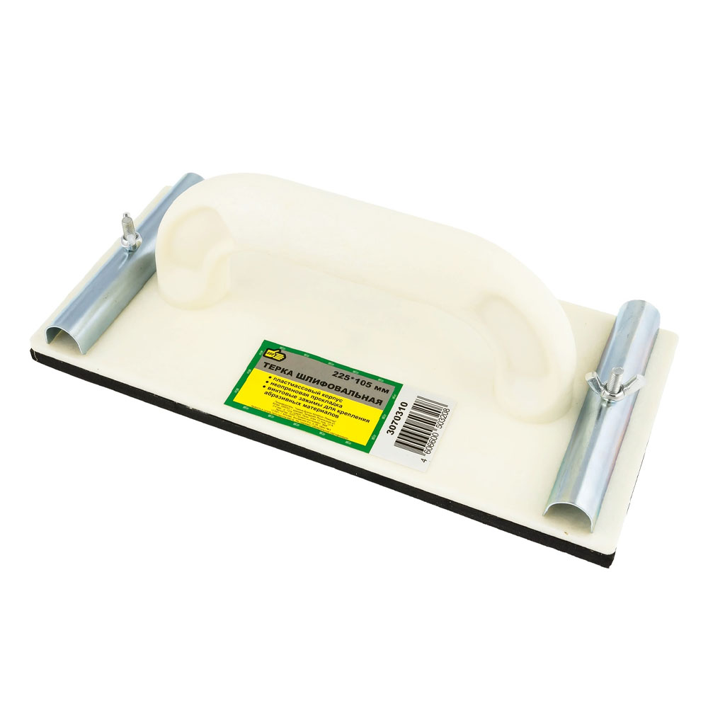 Инструмент оснащен металлическими зажимами, с помощью которых фиксируются сетки и шлифовальные листы.