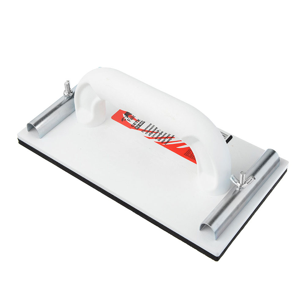 Конструкция изготовлена из пластика. Инструмент оснащен металлическими зажимами, с помощью которых фиксируются сетки и шлифовальные листы.