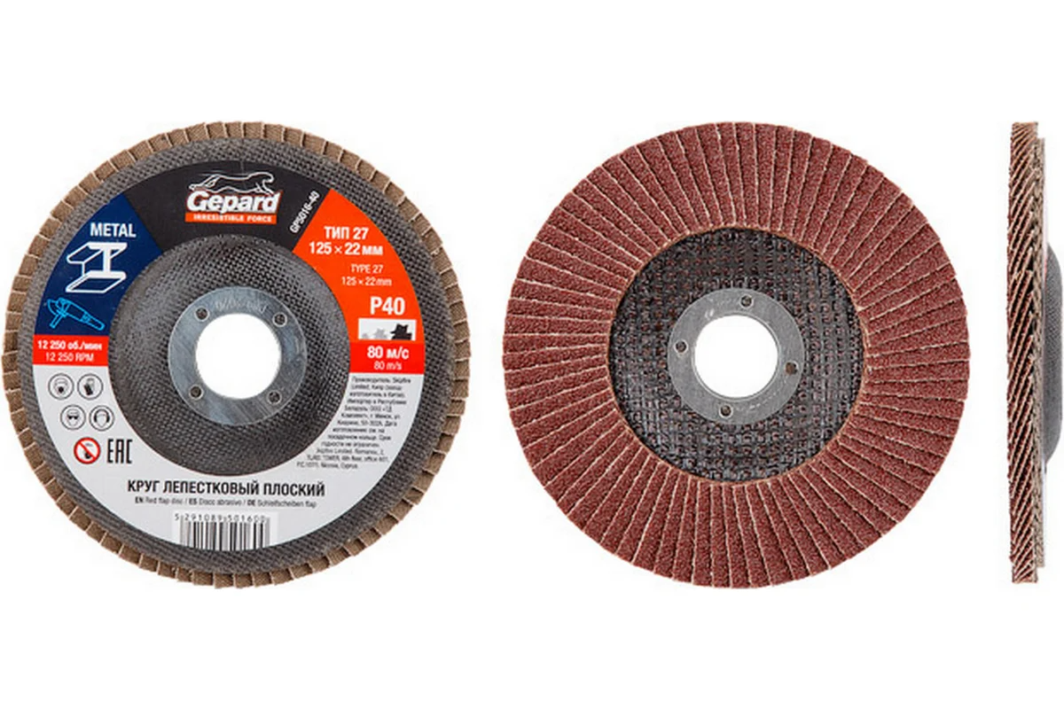 Круг лепестковый 125x22.2 мм, P40, плоский Gepard GP5016-40 рекомендован для работы с плоскими деталями, внешними швами на прямолинейных поверхностях. Предназначен для шлифовальных работ по металлу, инструментальной стали, чугуну, дереву и пластику. Материал: корунд (оксид алюминия), тканевая основа, обод из инструментальной стали. Применяется с УШМ соответствующего типоразмера. Форма круга: плоская прямая (T27).