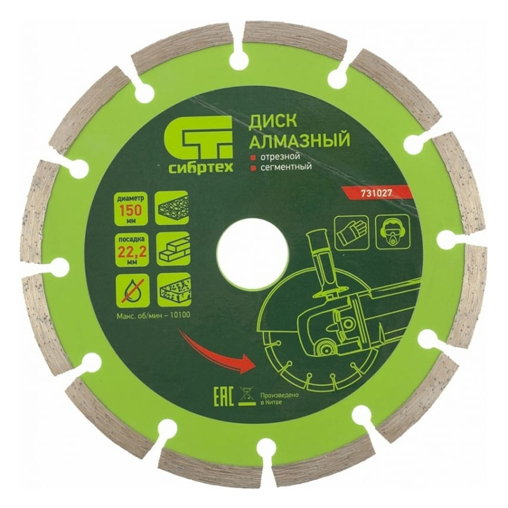 Диск алмазный отрезной сегментный Сибртех применяется для сухой резки бетона, камня, шлакоблока, тротуарной плитки и кирпича.