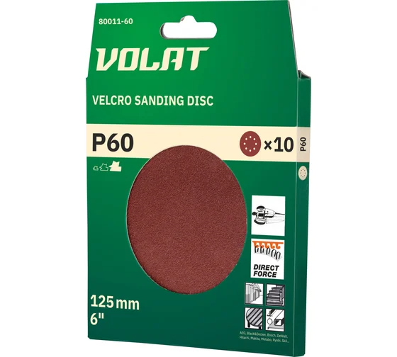 Шлифлист круглый 10 шт, 125 мм, Р60 ВОЛАТ 80011-60 для шлифовально-отделочных работ по металлу, дереву, пластику и другим материалам. Применяется в эксцентриковых шлифмашинах/УШМ соответствующего типоразмера. Абразивная составляющая оксид алюминия. Подложка ворсовая (тканевая) для липучки.