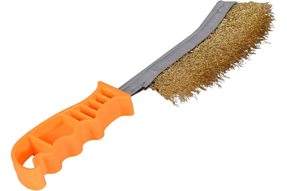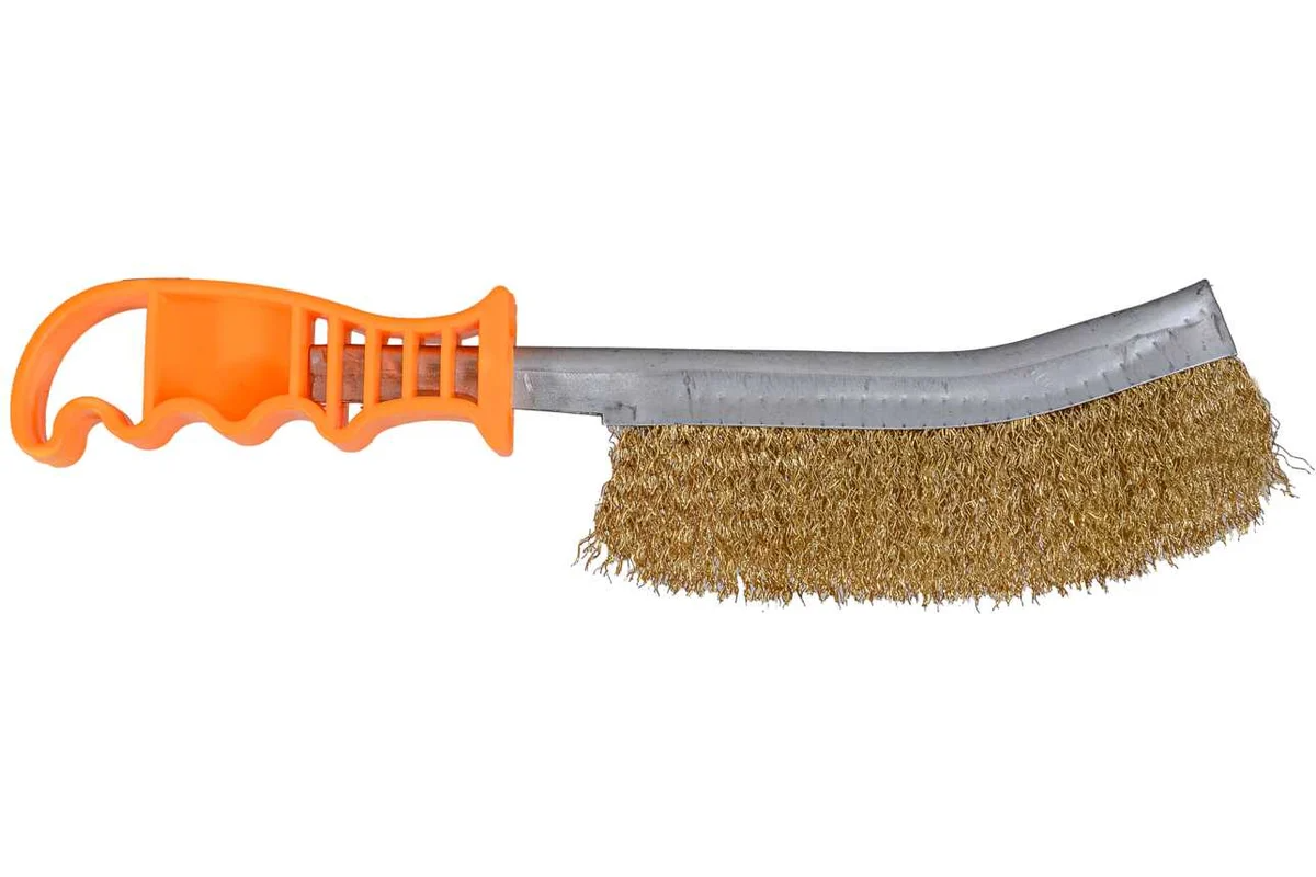 Она состоит из металлического корпуса и стальной латунированной рифленой проволоки. Пластмассовая рукоятка щетки имеет рифленую поверхность, что облегчает ее захват. Общая длина - 240 мм.