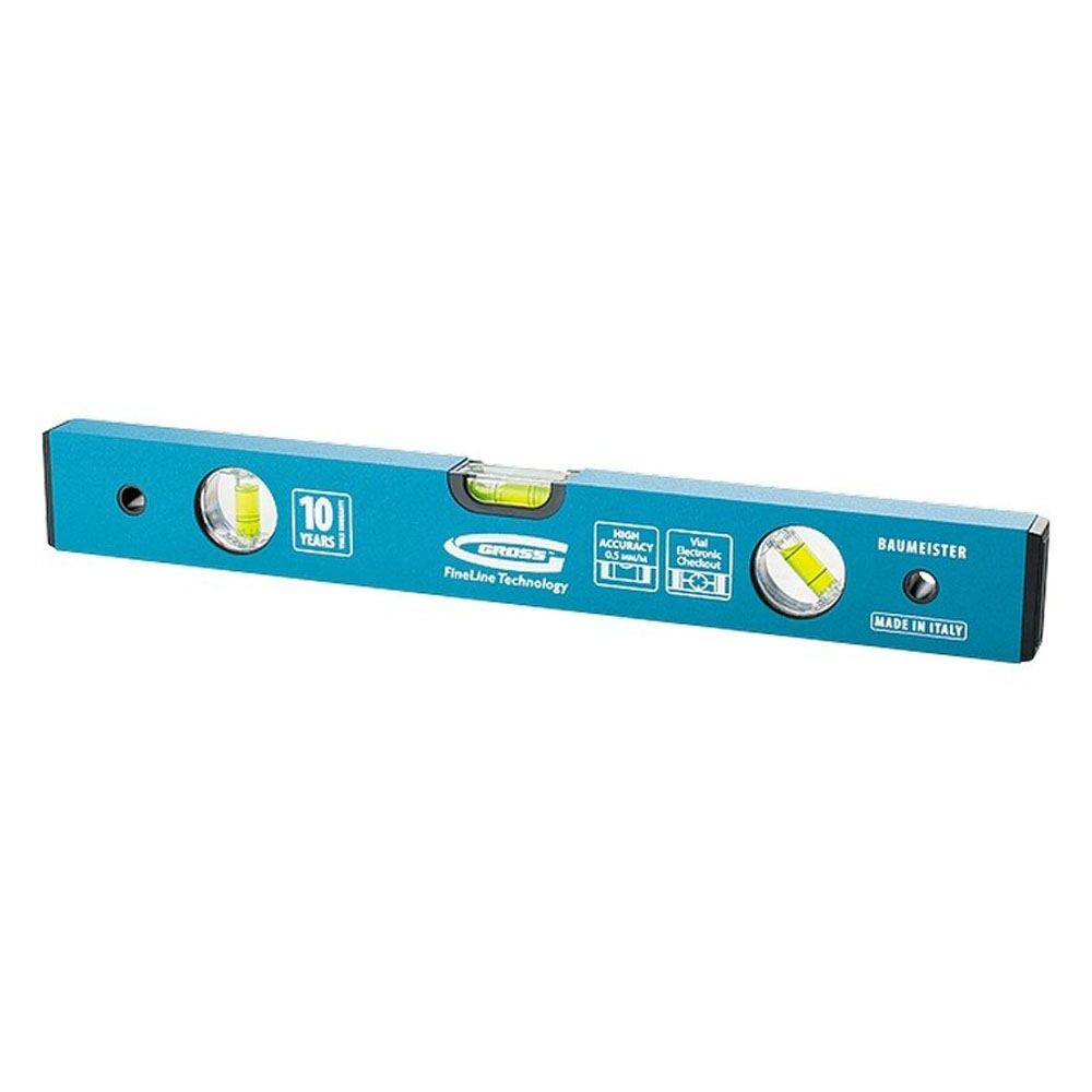 Усиленный алюминиевый уровень оснащен тремя колбами для определения отклонений от горизонтальности, вертикальности и от угла 45 градусов.