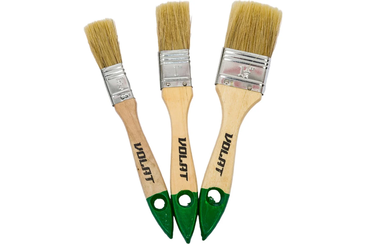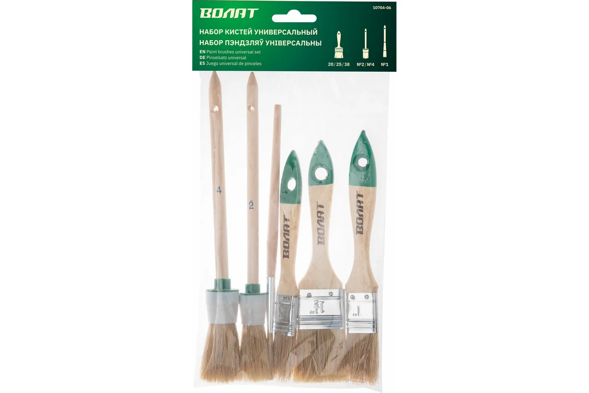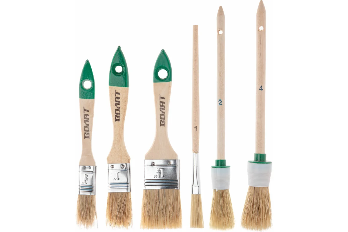 Набор кистей ВОЛАТ 6 предметов 10704-06 предназначен для малярных работ, нанесения лаков и масляных красок. Натуральная светлая щетина одинарной выварки устойчива к сильным растворителям, обладает хорошей краскоотдачей, обеспечивая равномерное распределение краски по окрашиваемой поверхности. Эргономичная деревянная рукоять обеспечивает комфортную эксплуатацию. Металлический бандаж с антикоррозийным покрытием отличается надежностью и долговечностью.