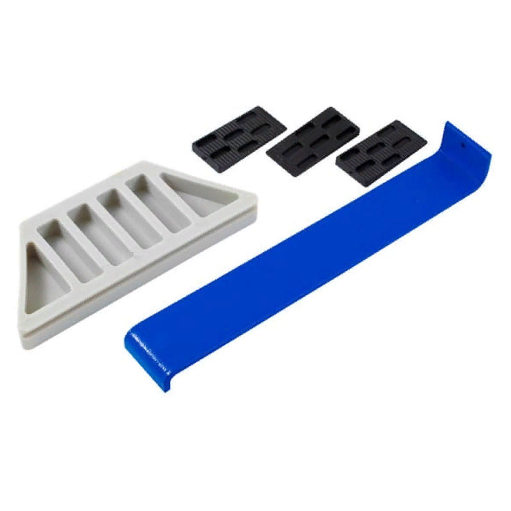 Клинья формируют отступ от стены, скоба упрощает укладку последней доски ламината, не повреждая замки и поверхность изделия.