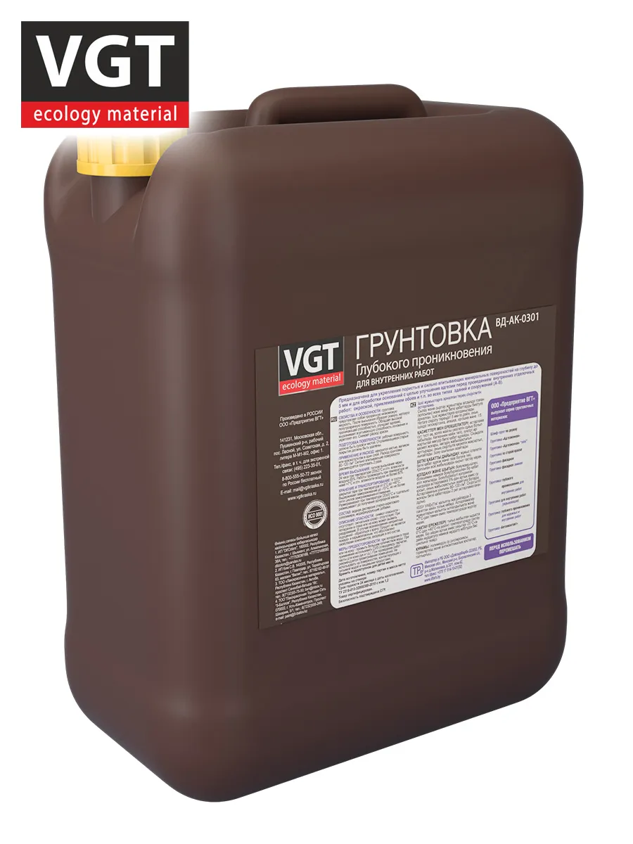 Грунтовка глубокого проникновения для внутренних работ VGT ВД-АК-0301, 10 кг.Грунтовка глубокого проникновения для внутренних работ ВД-АК-0301 представляет собой прозрачную низковязкую жидкость. После высыхания образует ровную, матовую полупрозрачную поверхность. Обладает высокой проникающей способностью, улучшает адгезию, выравнивает впитывающую способность основания и укрепляет его. Снижает расход краски.