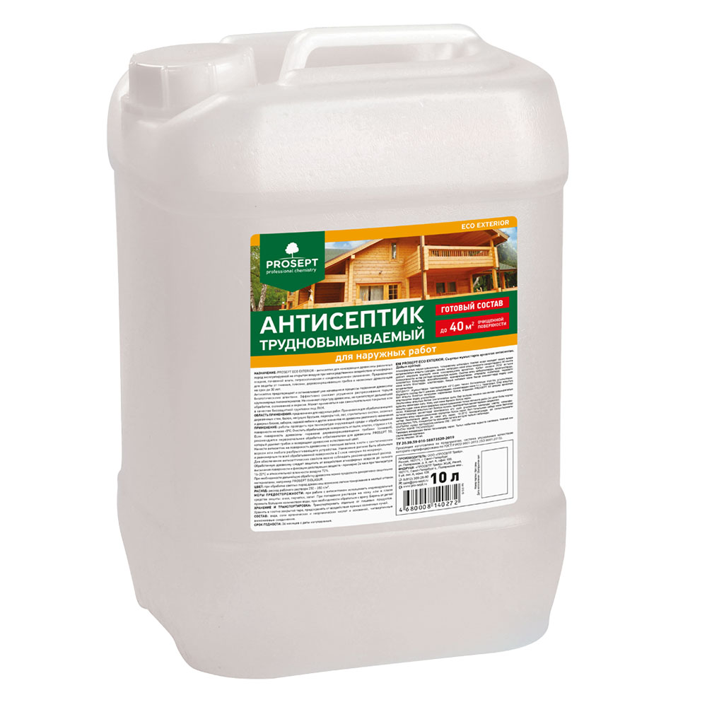 Антисептик для наружных работ PROSEPT ECO EXTERIOR Готовый состав защищает древесину от гниения, плесени, синевы и насекомых-древоточцев и не смывается с поверхности дерева осадками при эксплуатации древесины на открытом воздухе. Используется для обработки внешних деревянных стен, балок, несущих брусьев, перекрытий, лаг, стропильных систем, оконных и дверных блоков, заборов, садовой мебели и других элементов из древесины различного назначения.