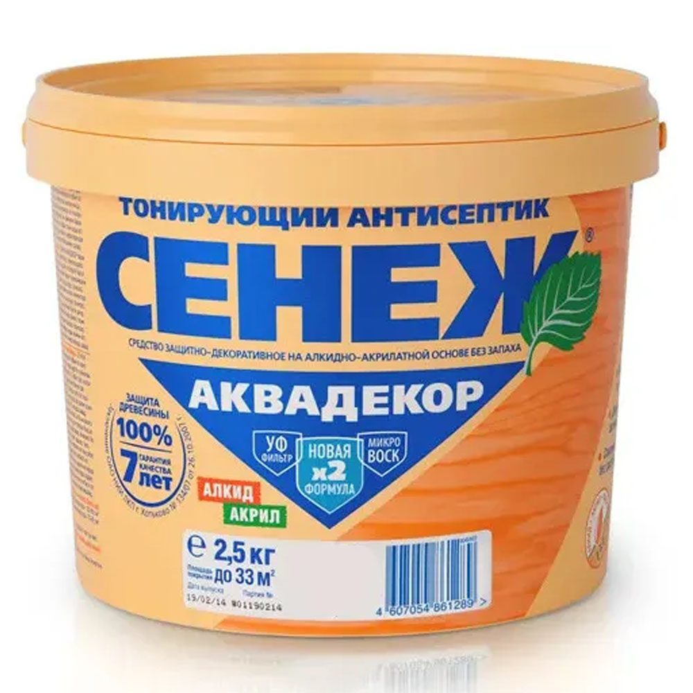 Антисептик СЕНЕЖ АКВАДЕКОР предназначен для долговременной защиты древесины от атмосферных осадков, плесневых, деревоокрашивающих и дереворазрушающих грибов, водорослей и насекомых-древоточцев, а также декоративной отделки под ценные породы. Сочетание в СЕНЕЖ АКВАДЕКОР алкидов, акрилатов и льняного масла улучшает проникновение в древесину, формирует эластичное дышащее защитное покрытие с мягким шелковистым блеском.