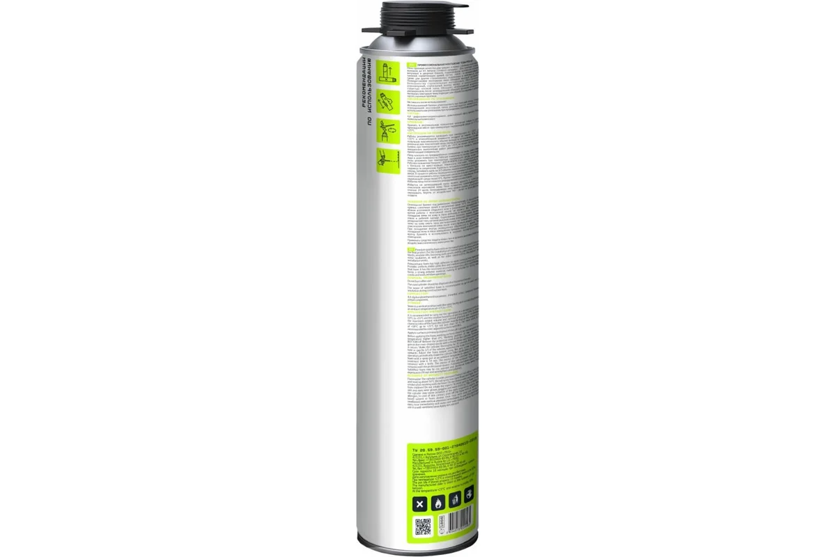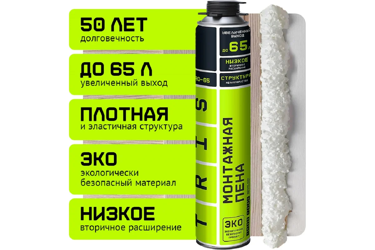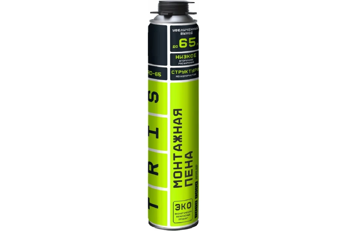 ПРОФЕССИОНАЛЬНАЯ МОНТАЖНАЯ ПЕНА PRO-65 - это высококачественный продукт, предназначенный для использования под пистолетом для монтажной пены. Эта всесезонная строительная пена идеально подходит для средне- и мелкобюджетных монтажных работ, позволяя получить до 65 литров готового продукта. Пена PRO-65 обладает широким спектром применения, начиная от монтажа оконных витражей и дверных блоков, подоконников и креплений стеновых панелей, и заканчивая герметизацией щелей, пустот, а также тепло- и шумоизоляцией. Одной из особенностей PRO-65 является ее высокая адгезия к большинству строительных материалов. Она обеспечивает равномерный, стабильный выход пены и создает мелкопористую структуру. После затвердевания, пена образует прочный полимерный материал с необходимым вторичным расширением, что делает ее подходящей для обработки крупных щелей и пустот, оконных проемов. Пена PRO-65 рекомендуется использовать при температуре от -10°C до +35°C при относительной влажности воздуха не менее 50%. Для достижения максимальног