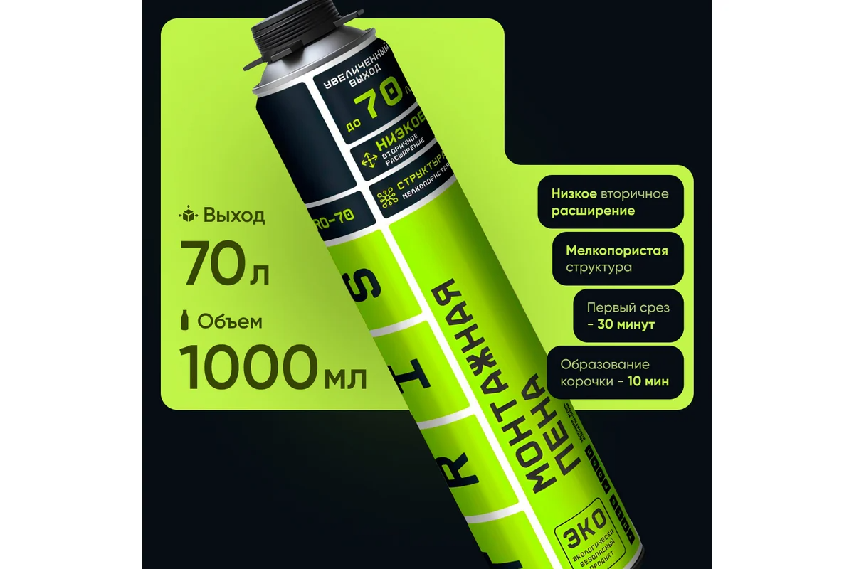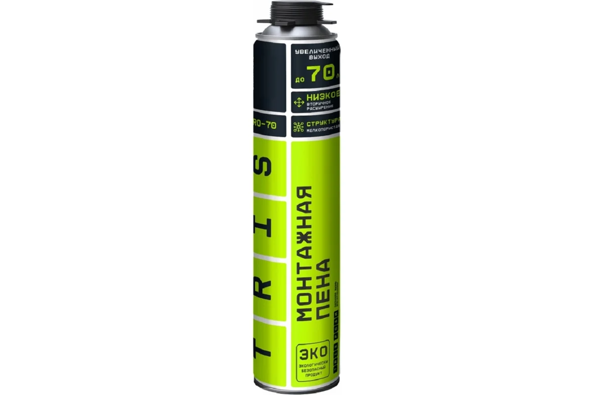 ПРОФЕССИОНАЛЬНАЯ МОНТАЖНАЯ ПЕНА PRO-70 - это высококачественный продукт, предназначенный для использования под пистолетом для монтажной пены. Эта всесезонная строительная пена идеально подходит для средне- и мелкобюджетных монтажных работ, позволяя получить до 70 литров готового продукта. Пена PRO-70 обладает широким спектром применения, начиная от монтажа оконных витражей и дверных блоков, подоконников и креплений стеновых панелей, и заканчивая герметизацией щелей, пустот, а также тепло- и шумоизоляцией. Одной из особенностей PRO-70 является ее высокая адгезия к большинству строительных материалов. Она обеспечивает равномерный, стабильный выход пены и создает мелкопористую структуру. После затвердевания, пена образует прочный полимерный материал с необходимым вторичным расширением, что делает ее подходящей для обработки крупных щелей и пустот, оконных проемов. Пена PRO-70 рекомендуется использовать при температуре от -10°C до +35°C при относительной влажности воздуха не менее 50%. Для достижения максимальног