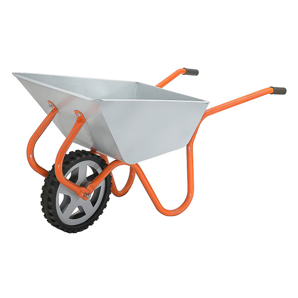Надежная одноколесная тачка с цельносварным кузовом и колесом из литой резины.