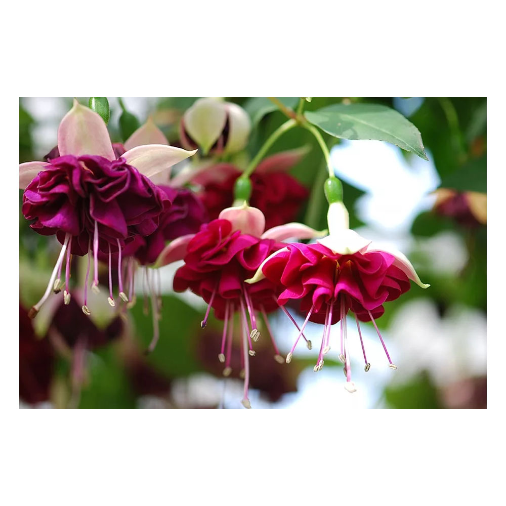 Ботаническое описание. Деревце или кустарник, с гибкими ветвями, покрытыми небольшими зелёными или слегка красноватыми листьями. Листья супротивные овально-ланцетной формы, 4-5 см длиной, заострённые на конце и слегка зубчатые по краю. Цветёт обильно и долго. Цветки фуксии бывают разной окраски, простые или махровые. Цветок состоит из двух частей: из венчиковидной яркой чашечки и трубчатого венчика с отогнутыми листьями.