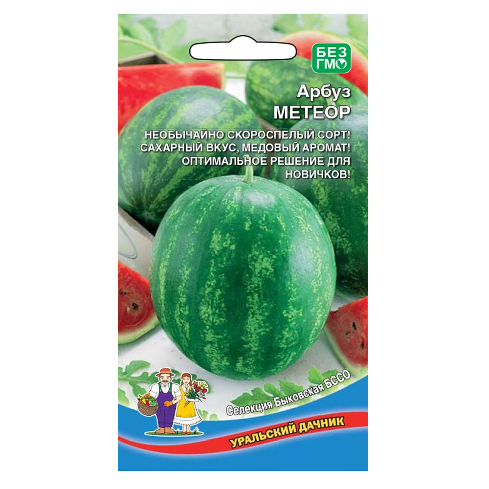 Новый сорт арбуза Метеор отличается дружным плодообразованием и созреванием, высокой потенциальной урожайностью. Сорт раннеспелый, период от полных всходов до первого сбора плодов – 60-92 дня. Главная плеть длинная. Плод округлый, массой плода 7-12 кг с очень тонкой кожурой. Мякоть розово-красная, хорошей плотности. Вкус выраженный, отличный. Обладает комплексной устойчивостью к антракнозу и фузариозу, засухоустойчивый. Транспортабельный. Предназначен для получения ранней товарной продукции, плоды сохраняют товарные качества в течение 30 дней после съёма.
