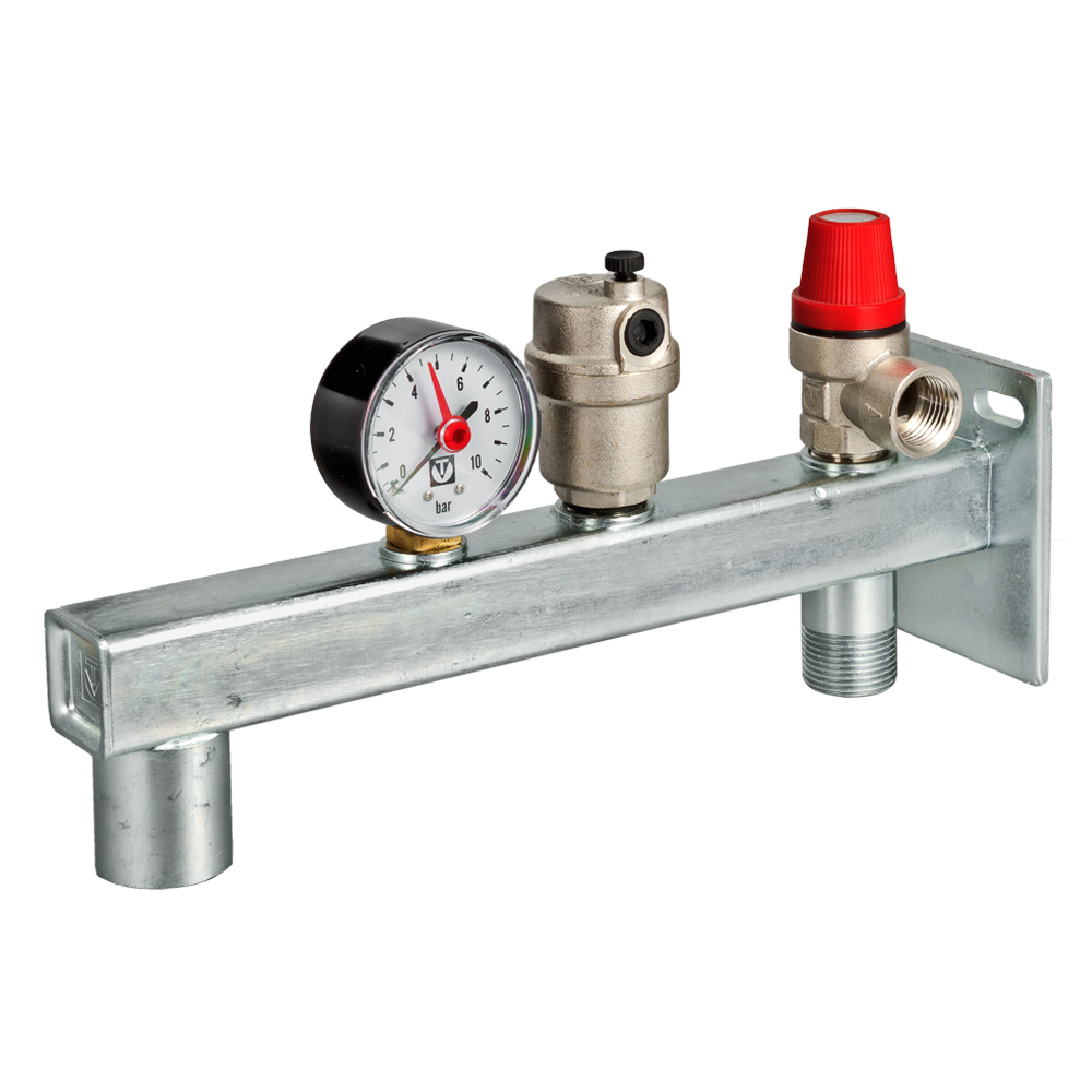 (VT.495.0) Группа безопасности расширительного бака представляет собой смонтированные на полой консоли из оцинкованной стали предохранительный клапан с фиксированной настойкой, автоматический воздухоотводчик, манометр. Консоль оборудована резьбовыми патрубками – присоединительным и для мембранного бака, фланцем настенного крепления. Непосредственно к группе допускается подвешивать «мембранник» объемом до 50 л. Оборудование рассчитано на применение в системах тепловой мощности до 44 кВт (увеличивается заменой предохранительного клапана); номинальное давлением – 10 бар; максимальная температура рабочей среды (вода, пар, незамерзающий теплоноситель с концентрацией гликоля не выше 50 %) – 120 °C. Функциями изделия являются защита системы отопления/ГВС от превышения давления, завоздушивания, индикация текущего значения давления, крепление мембранного бака.