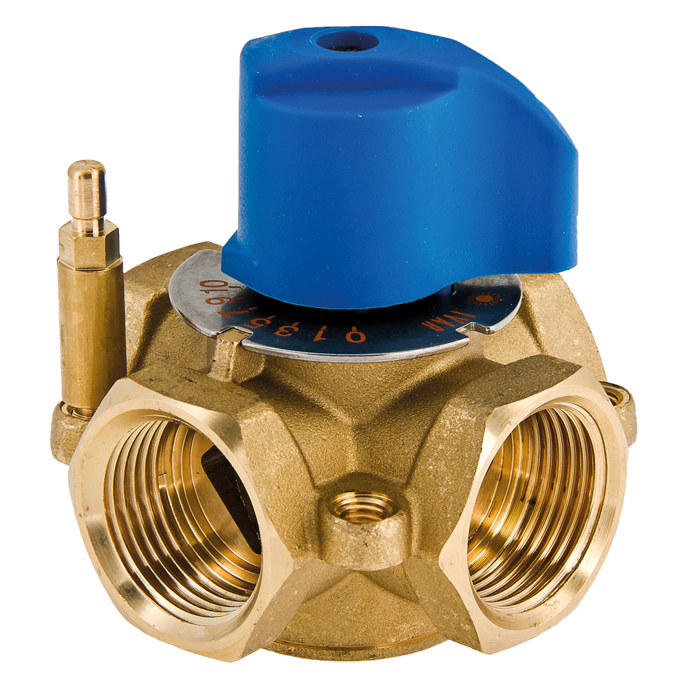 (VT.MIX04.G) Предназначен для использования в смесительных и разделительных узлах гидравлических систем. Управление клапаном может осуществляться вручную или с помощью сервопривода с крутящим моментом не менее 5 Н•м (рекомендуется модель VT M 106). Корпус и регулирующий элемент выполнены из латуни, что исключает возможность появления коррозионных отложений в рабочих зазорах. Уплотнение штока достигается с помощью двух колец из синтетического каучука EPDM PEROX. При этом верхнее кольцо легко заменить без полной разборки изделия. Клапан ремонтопригоден и состоит всего из четырех основных деталей, что повышает его надежность. Максимальная рабочая температура теплоносителя – 120 °C, нормативное давление – 10 бар. Резьба присоединений – внутренняя. Условные диаметры предлагаемых моделей – 3/4, 1, 1 1/4". Ручка управления входит в комплект.