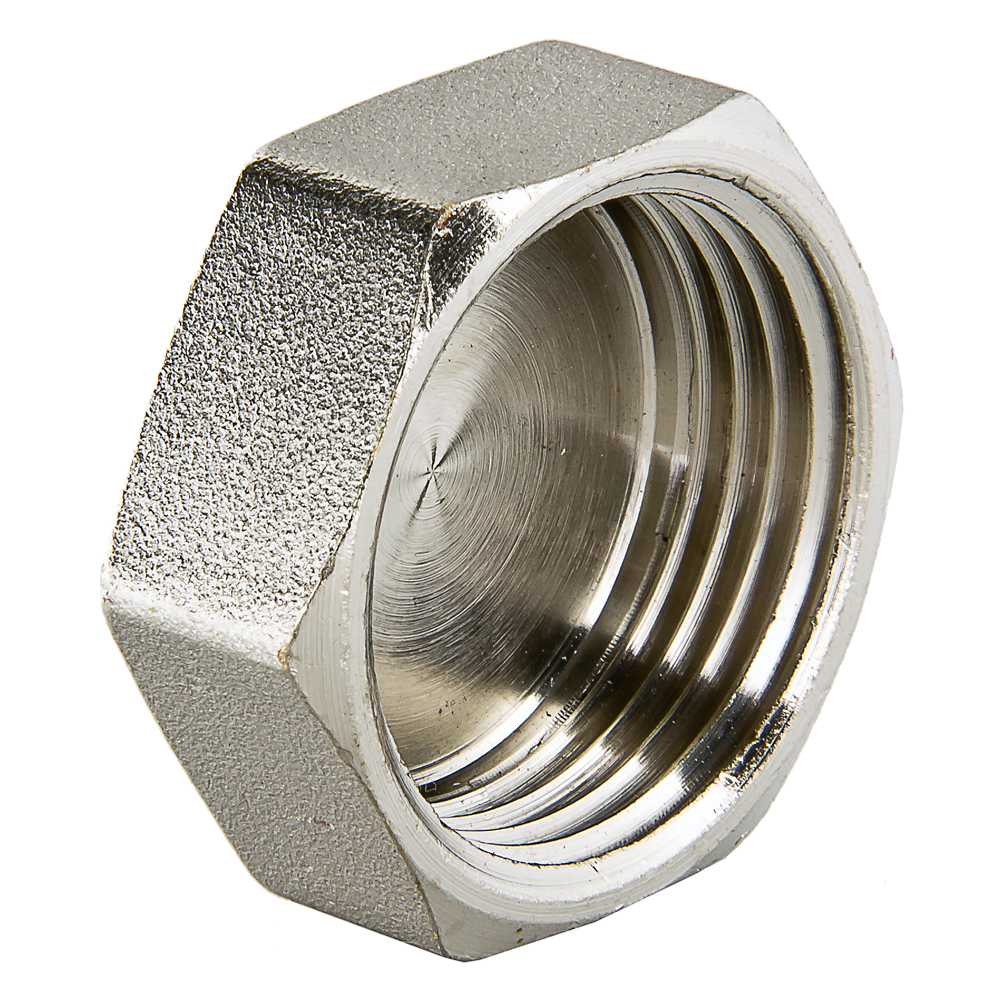 (VTr.590.N) Латунная никелированная трубопроводная заглушка с шестигранной головкой. Имеет внутреннюю трубную цилиндрическую резьбу по ГОСТу 6357 (ISO 228, EN 10226), совместимую также с наружной конической трубной резьбой по ГОСТу 6211 (ISO R7).