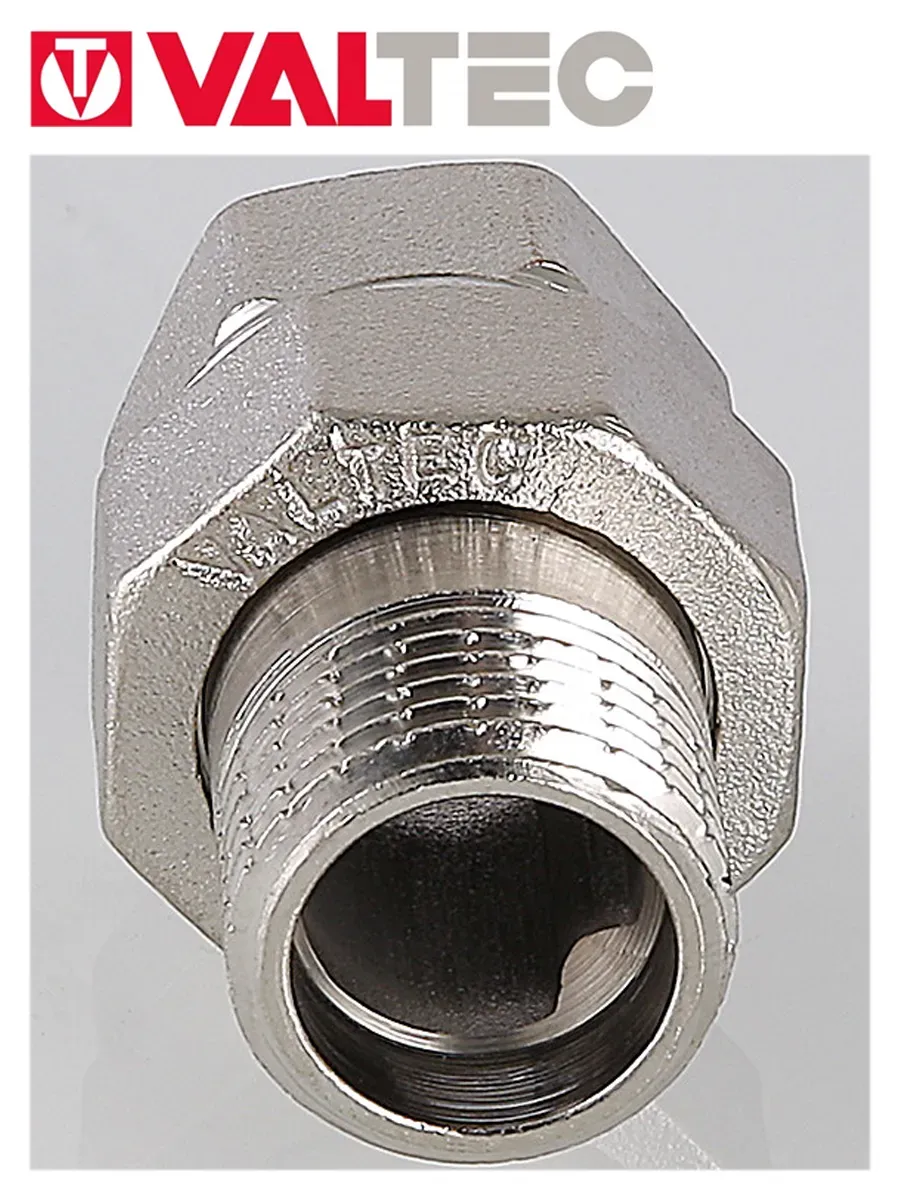 (VTr.341.N) Прямой разъемный сгон, смонтированный из двух частей с помощью накидной гайки (соединение типа «американка»). Резьба – внутренняя/наружная, цилиндрическая трубная по ГОСТу 6357 (ISO 228, EN 10226). Внутренняя резьба совместима также с наружной конической трубной резьбой по ГОСТу 6211 (ISO R7). Детали выполнены из латуни, никелированы. Уплотнительное кольцо – из синтетического каучука EPDM. Гайку следует накручивать с приложением момента не более 30 H•м.