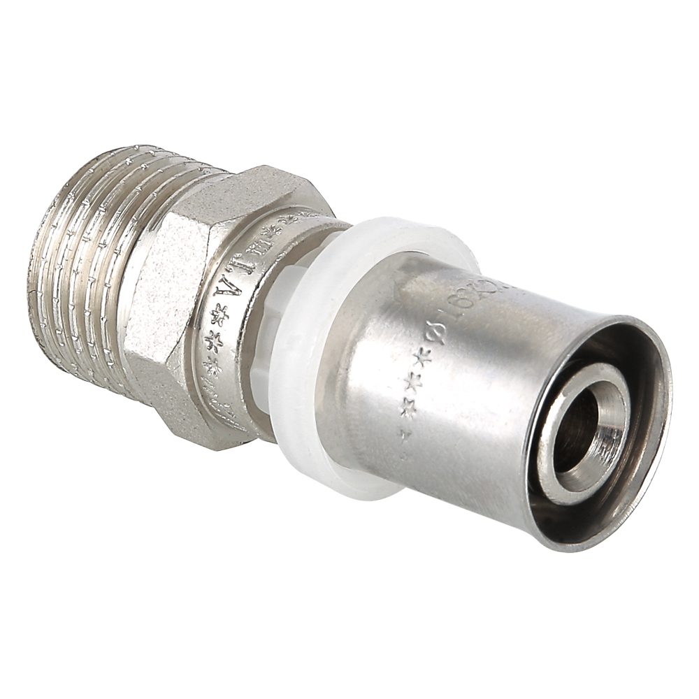 (VTm.201.N) Пресс-фитинг с переходом на наружную резьбу предназначен для соединения металлопластиковой или РЕХ-трубы с элементом системы, имеющим внутреннюю дюймовую резьбу. Корпус фитинга – латунный никелированный. Материал пресс-гильзы – нержавеющая сталь AISI 304, уплотнений (два кольца на штуцере) – EPDM, фиксатора – нейлон. Резьба – наружная, соответствующая ГОСТу 6357 – имеет насечки для наилучшего удержания уплотнительного материала при монтаже. Особенностями пресс-фитингов VALTEC являются увеличенная пропускная способность, прочность и термостойкость. Конструкция обеспечивает надежное соединение. Для монтажа применяется пресс-инструмент с насадками типа «ТН».