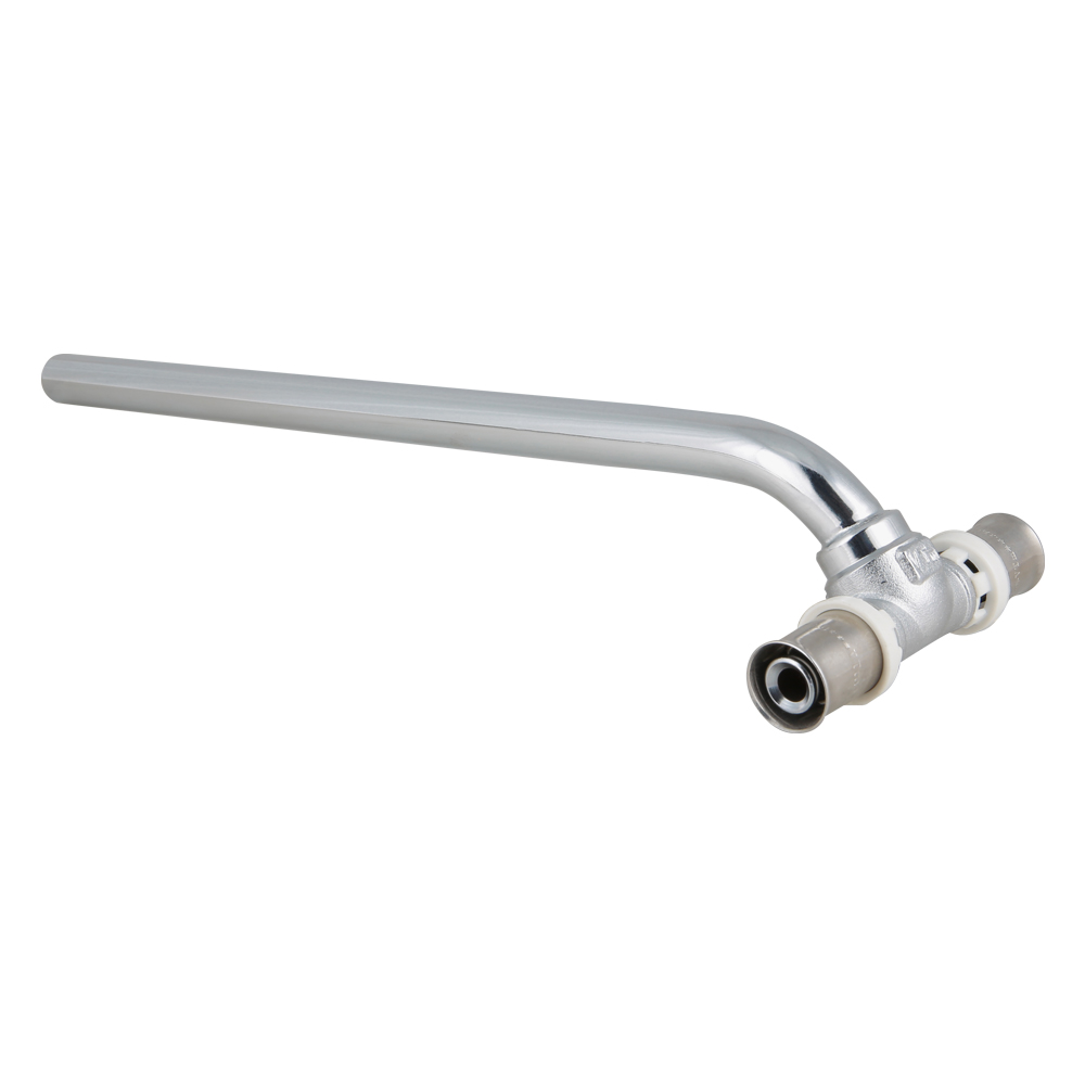 (VTm.282.N) Пресс-фитинг – тройник с хромированной латунной трубкой (наружный диаметр – 15, толщина стенки – 1 мм), предназначенный для подключения отопительного прибора к разводке из металлополимерных труб.