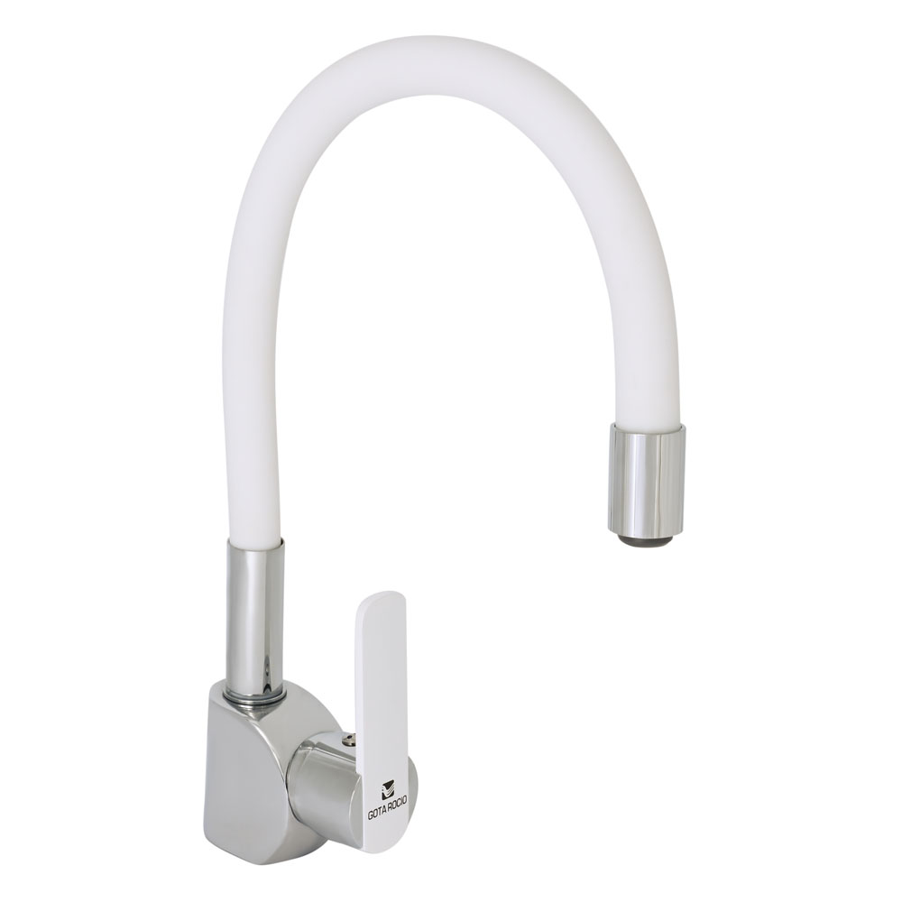Смеситель для кухни с высоким гибким силиконовым изливом Gota Rocio изготовлен из качественных материалов, никель-хромовое покрытие соответствует стандартам качества, обеспечивает стойкость и зеркальный блеск в течении всего срока службы. Высокий поворотный излив на 360 градусов, высота излива 425 мм. Съемный пластиковый аэратор гарантирует ровный поток воды. Картридж d 35 мм обеспечивает плавный ход ручки смесителя. Цвет - хром+белый