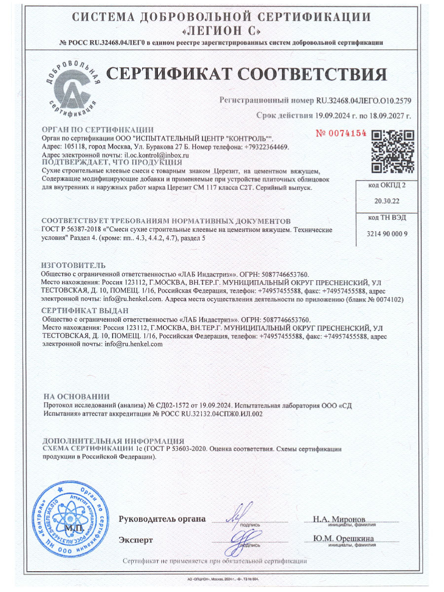 Клей СМ 117 предназначен для крепления всех видов минеральных плиток — керамических, керамогранитных, клинкерных, каменных (кроме мраморных) и т.п. размером до 60×60 см на недеформирующихся минеральных основаниях (таких как бетон, цементные стяжки, цементные и цементо-известковые штукатурки), на стенах и полах, внутри и снаружи зданий.