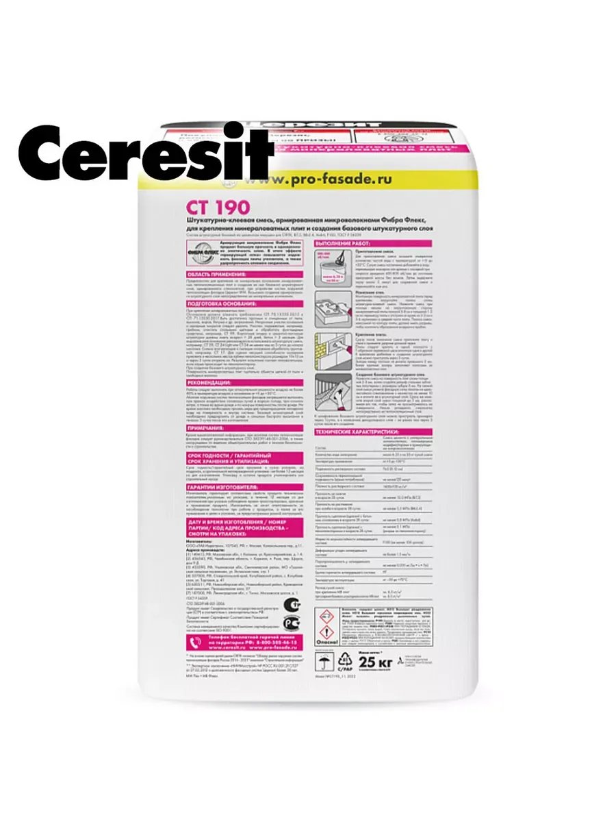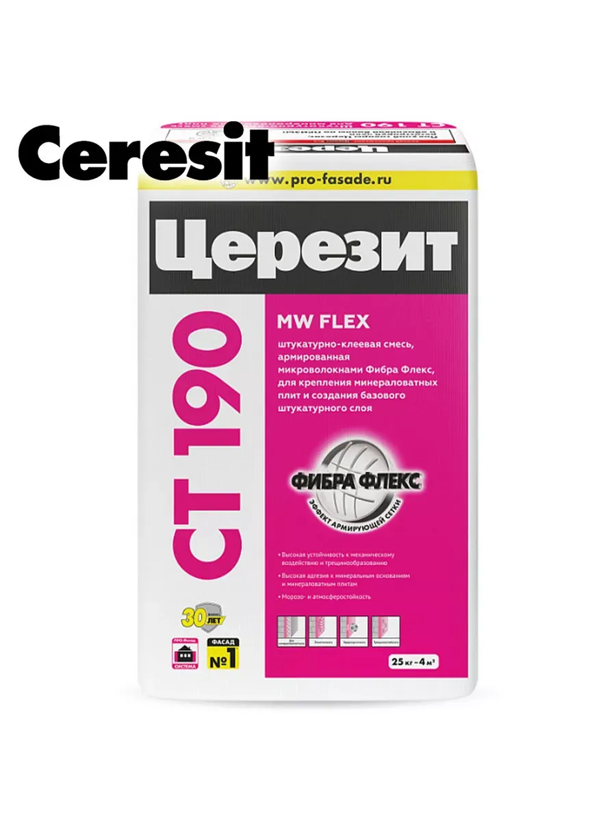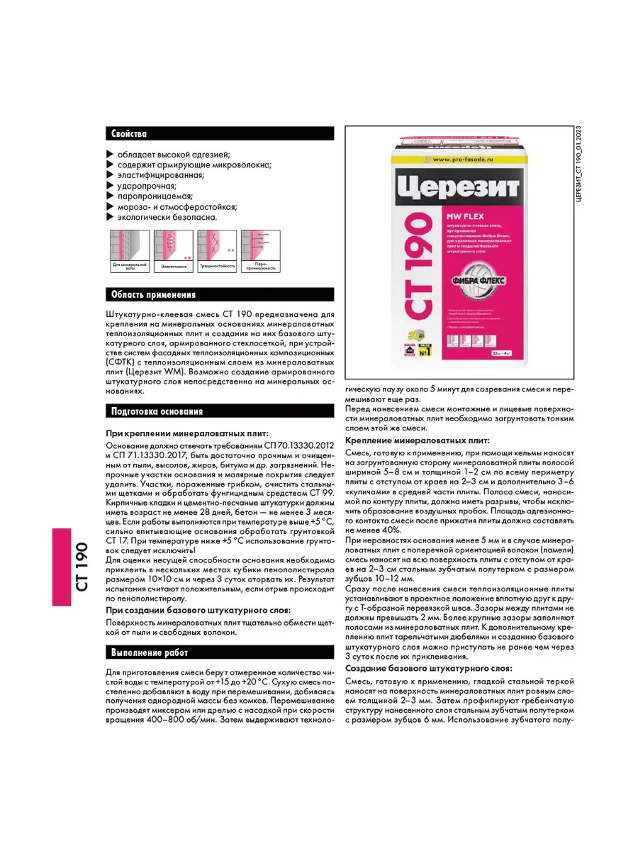 Штукатурно-клеевая смесь CT 190 предназначена для крепления на минеральных основаниях минераловатных теплоизоляционных плит и создания на них базового штукатурного слоя, армированного стеклосеткой, при устройстве систем фасадных теплоизоляционных композиционных (СФТК) с теплоизоляционным слоем из минераловатных плит (Церезит WM).