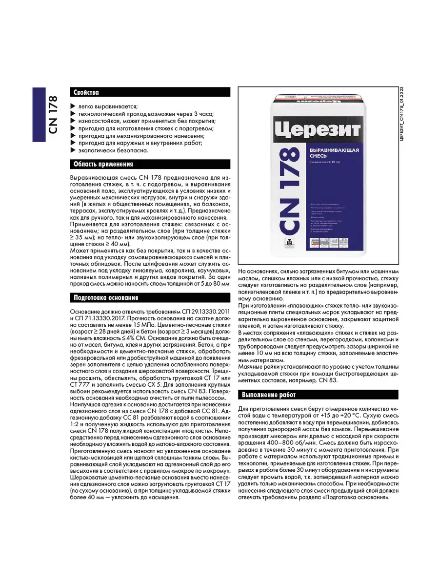 Выравнивающая смесь CN 178 предназначена для изготовления стяжек, в т.ч. с подогревом, и выравнивания оснований пола, эксплуатирующихся в условиях низких и умеренных механических нагрузок, внутри и снаружи зданий (в жилых и общественных помещениях, на балконах, террасах, эксплуатируемых кровлях и т.д.). Предназначена как для ручного, так и для механизированного нанесения.