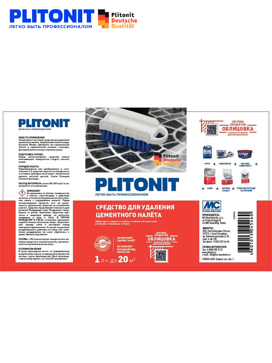 Средство для удаления цементного налета Plitonit — специализированное средство, созданное для очистки следов ремонта. Практика показывает, что универсальные вещества не всегда гарантируют удовлетворительный результат. Тогда на помощь приходят средства, формула которых разработана для решения конкретной задачи. При этом учитываются особенности загрязнения и целевого основания. Рекомендации по использованию: