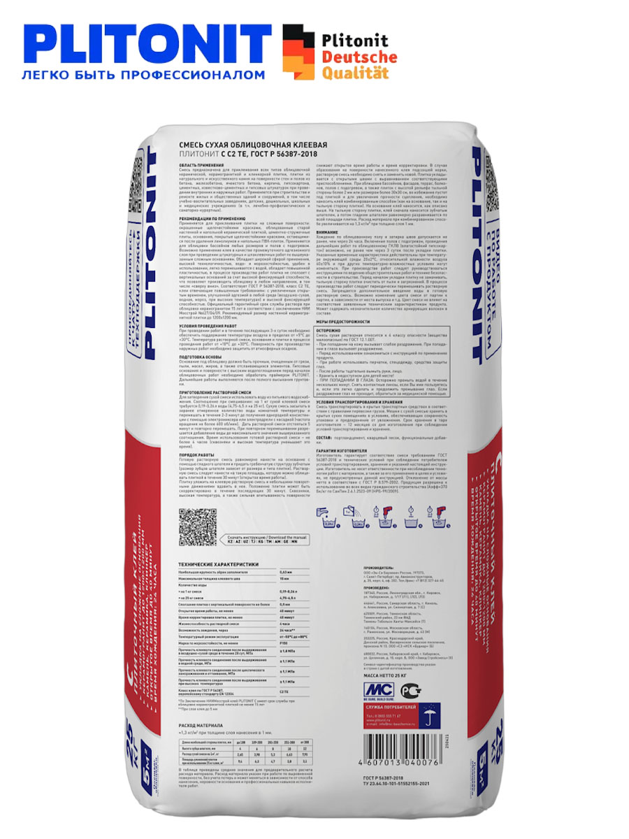 PLITONIT С– клей для облицовки сложных поверхностей всеми видами плитки С2 ТЕ, ГОСТ Р 56387.