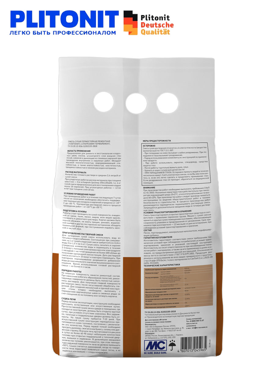 Предназначен для ремонта и восстановления кладочных швов, сколов, штукатурного слоя внешних стен печей, каминов и дымоходов из глиняных кирпичей при проведении внутренних и наружных работ. Обладает высокой технологичностью, водоудерживающей способностью, а также влагостойкостью, эластичностью, трещиностойкостью и низким расходом материала.