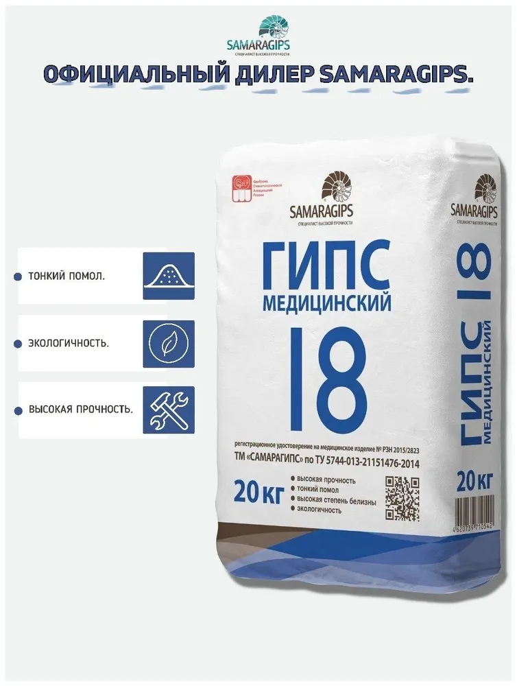 Гипс медицинский марки Г-18 высокопрочный для изготовления временных протезов,муляжных слепков и иммобилизирующих повязок. Одобрено Стоматологической Ассоциацией России.