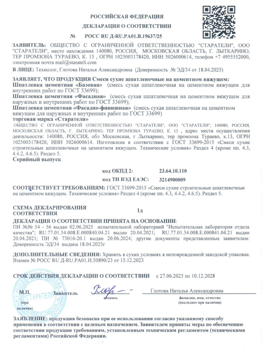 Шпатлевка цементная "Фасадная" ГОСТ 33699.